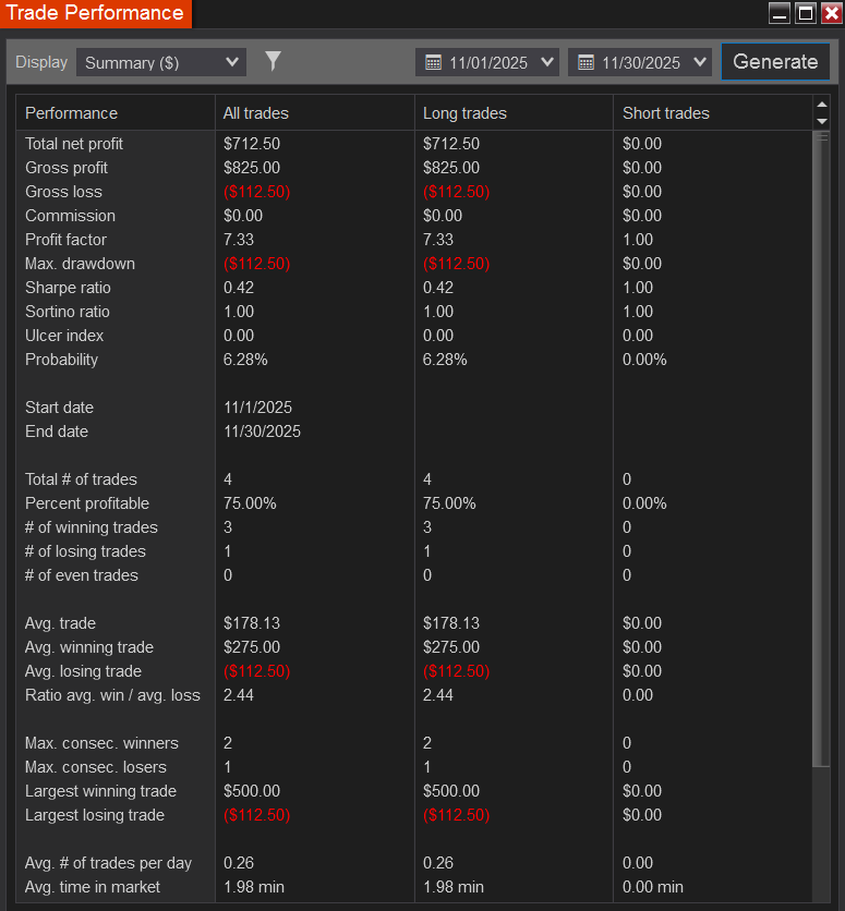 Based on 1 ES contract traded on live trades, not a backtest, with a $10,000 account.